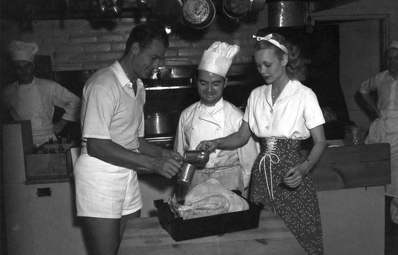 Charles Farrell, Chef Pierre and Jayne Wyman cooking Thanksgiving turkey at the Racquet Club 1939